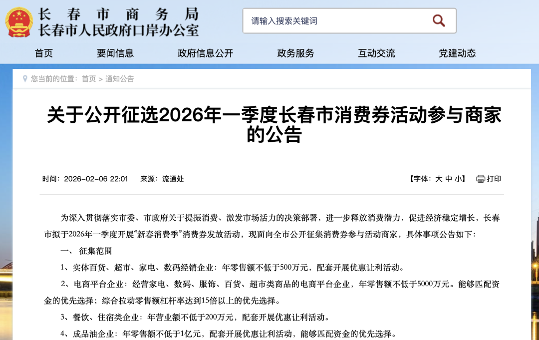 为深入贯彻落实市委、市政府关于提振消费、激发市场活力的决策部署,进一步释放消费潜力,促进经济稳定增长,长春市拟于2026年一季度开展“新春消费季”消费券发放活动,现面向全市公开征集消费券参与活动商家,具体事项公告如下: